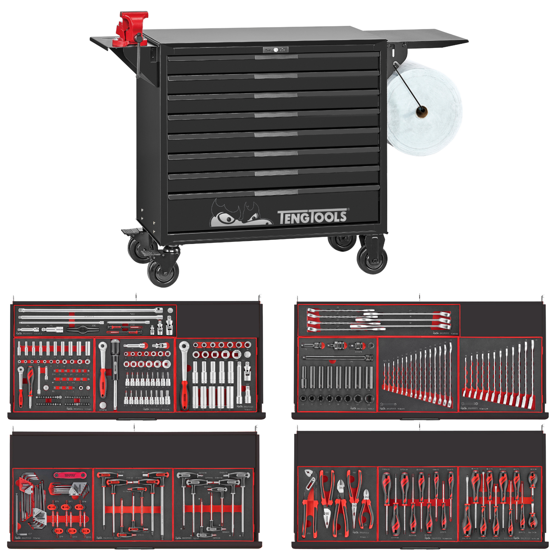 [ 447 PIECES ] This tool kit contains 19 EVA foam trays with 447 individual tools. [ 8 DRAWER TOOL BOX ] Supplied with a black 37 inch wide 8 drawer roller cabinet (TSW37B8) with a removable worktop. [ BUILT TO LAST ] The tool box is crafted with a robust 3-piece heavy gauge steel cabinet frame, fortified with our advanced 5-step phosphate-free rust protection, features a new reinforced fully extendable drawer design which is capable of holding up to 88 lbs, a flexible security locking option allowing you to secure your tools by switching between combination and key locks depending on your preference, flat aluminum drawer front handles with space for labelling for quick tool identification, comfort grip handles ergonomically designed for ease of movement which can be used with a side shelf to create extra space for storing longer items conveniently at your side (side shelf sold separately), foam mats supplied in each drawer to protect loose tools, 3-step ball bearing sliders to ensure a smooth and reliable opening and closing action every time and heavy-duty castors (two swivel and two fixed, with brakes) to navigate your workspace with ease. [ EVA FOAM ORGANIZATION ] Each tool has been scanned in a CAD CAM system with the tool’s exact shape cut out in a three-coloured EVA foam block. The top layer of the foam is black, the intermediate layer white and the bottom layer red, so that as soon as the tool has been removed its position is clearly visible in red. The size and or description of each tool has been etched next to its position for immediate identification. [ SOCKETRY ] 1/4, 3/8, 1/2 & 3/4 inch drive metric shallow/regular and deep sockets and accessories. [ IMPACT TOOLS ] 1/2 inch drive metric shallow/regular and deep sockets and accessories. [ WRENCHES ] Combination and ratcheting wrenches. [ SCREWDRIVERS ] TX, slotted/flat, PH and PZ screwdrivers. [ PLIERS ] Side cutters, linesman, long nose and water pump pliers. [ + MORE ] 1/4 inch hex drive impact bits, rivet tools, ratchets, T-handle Hex & TX keys, Hex & TX Allen keys and torque wrenches (see INCLUDED PRODUCTS section below for full details).