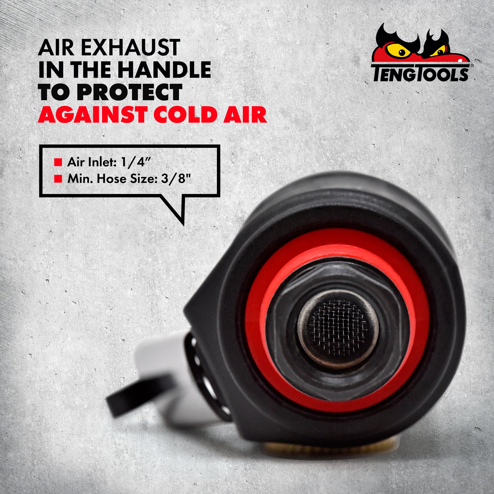 - Escape de aire en el mango para proteger contra el aire frío. Entrada de aire: 1/4 de pulgada. Tamaño mínimo de la manguera: 3/8 de pulgada