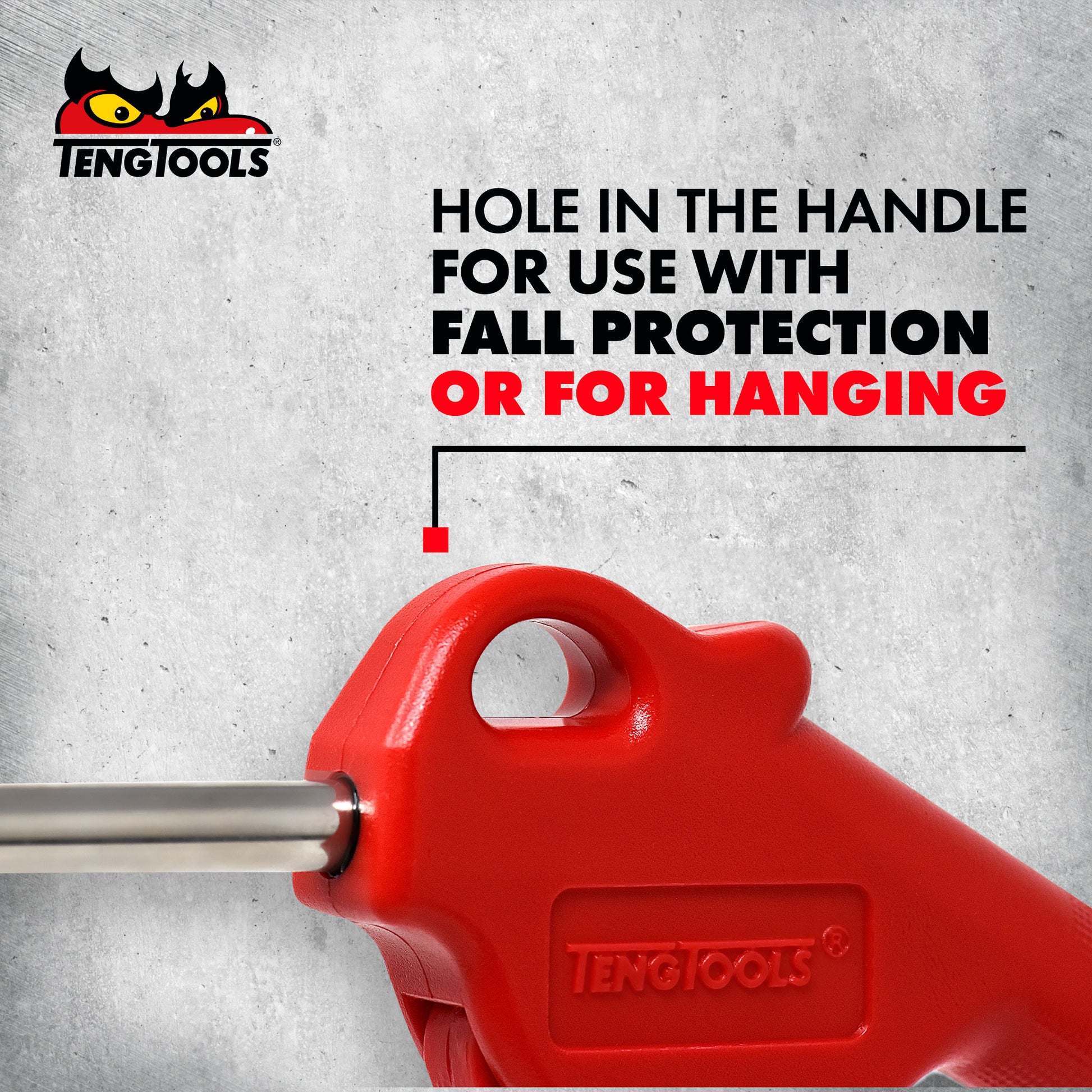 - Cuenta con un inserto de rosca de metal para mayor confiabilidad y un orificio en el mango para colgar o usar con un cable de protección contra caídas si es necesario.