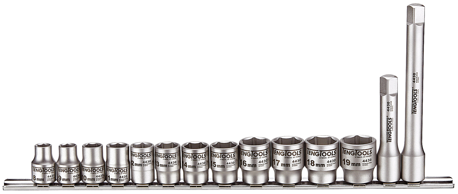 - 14 vasos de acero inoxidable con accionamiento de 3/8 de pulgada y barras de extensión suministrados en un riel de clip con accionamiento de 3/8 de pulgada