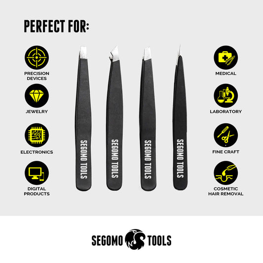 Segomo Tools - Ensemble de 4 pinces à épiler plates, coudées, pointues et inclinées en acier inoxydable - TW004