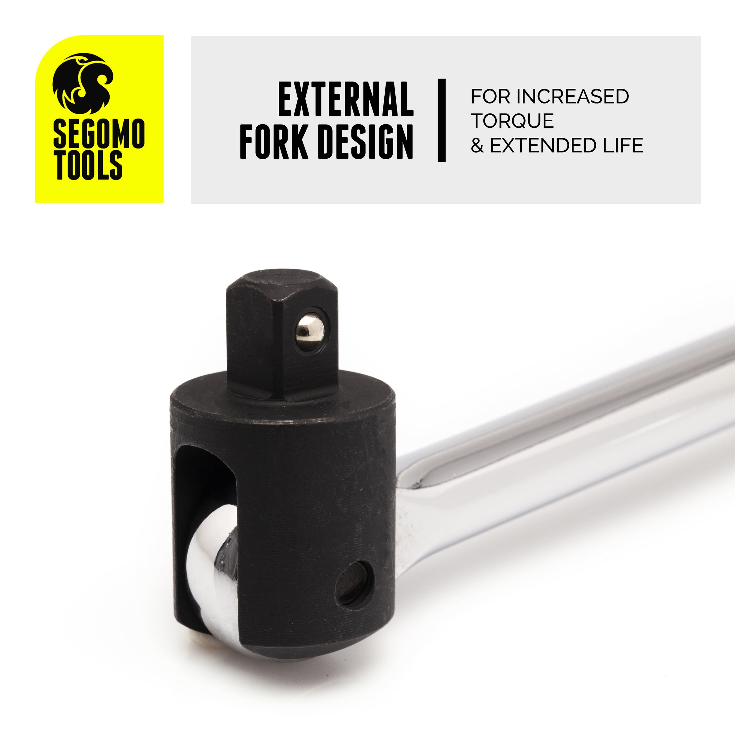 Chrome molybdenum steel head for extra strength and durability, external fork design for increased torque and extended life and internal spring to control the tension of the head, allowing it to hold it's position while installing sockets and fasteners.