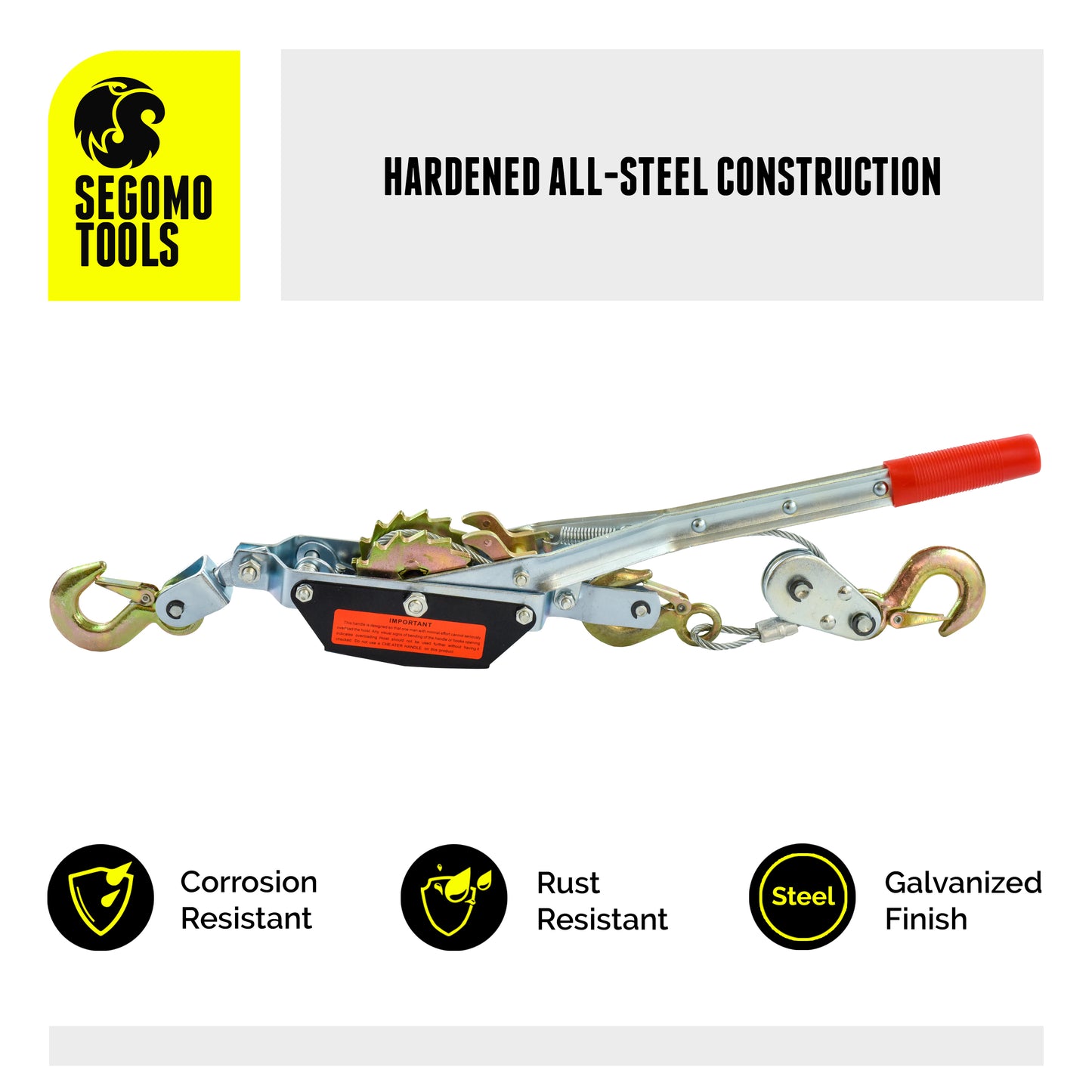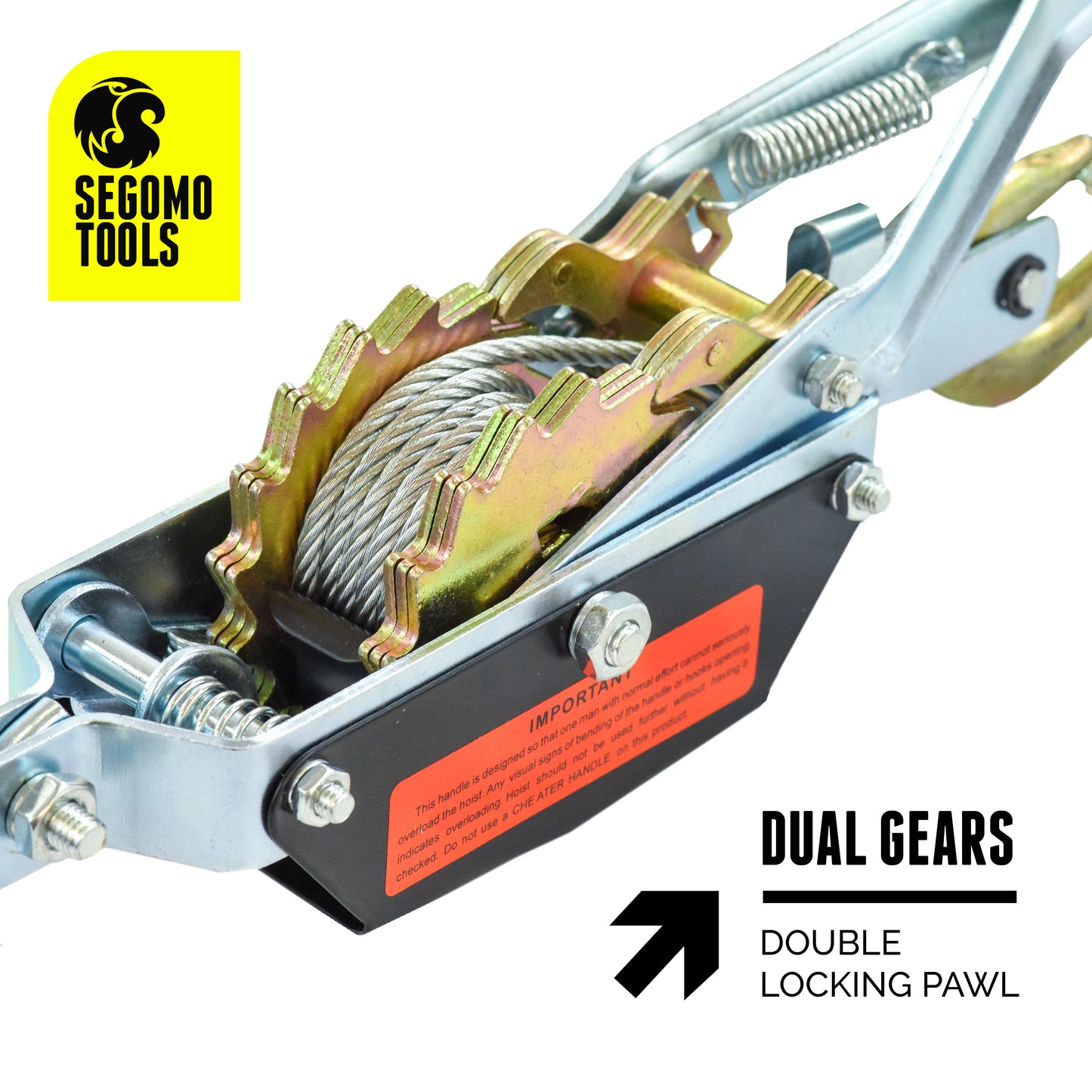 Segomo Tools 2 Ton Heavy Duty 3 Hook Steel Cable Dual Gear Power Ratchet Puller System - POWERP2