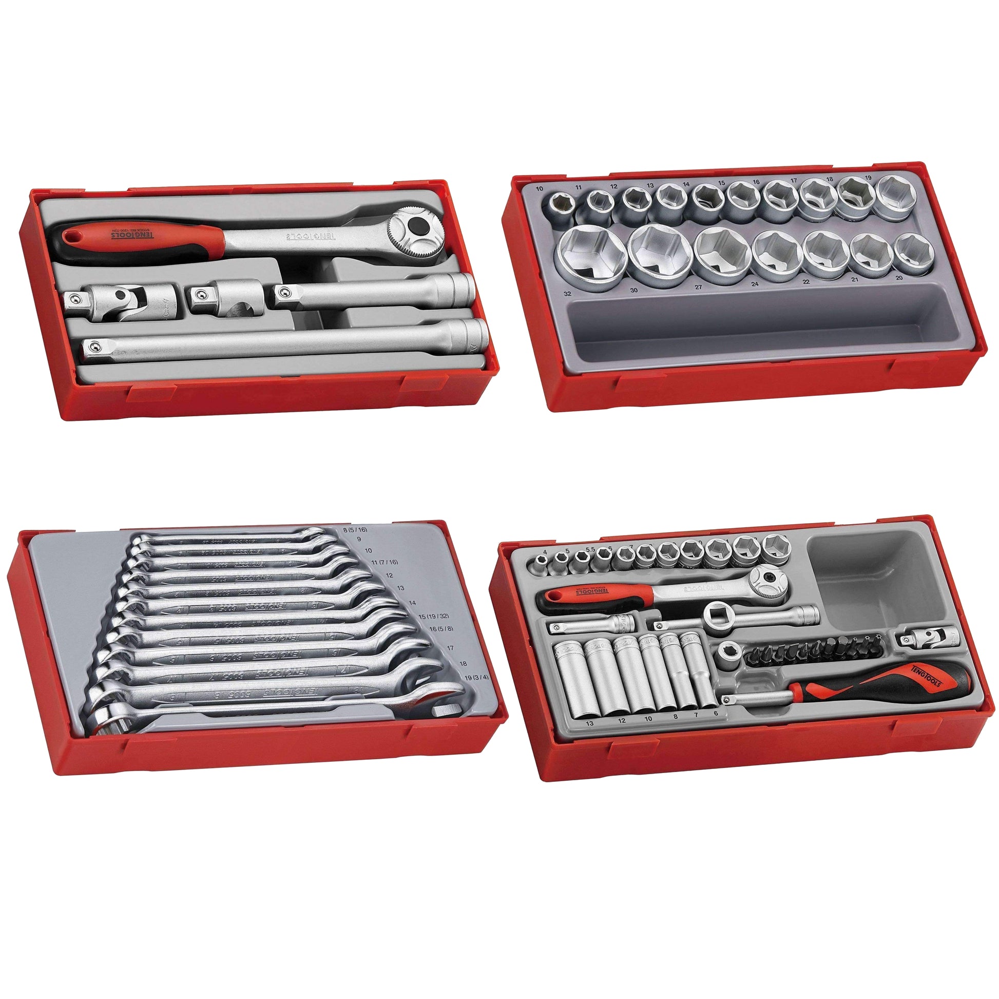 [ 173 PIECES ] This tool kit contains 11 tool trays with 173 individual tools. [ 4 DRAWER TOP BOX ] Supplied with a 26 inch wide 4 drawer top box (TC804EV). [ BUILT TO LAST ] Crafted with a robust 3-piece heavy gauge steel cabinet frame, fortified with our advanced 5-step phosphate-free rust protection, featuring a reinforced fully extendable drawer design which is capable of holding up to 66 lbs. [ SECURE ] Lockable keylock/front which covers the top of the drawer and the extending drawers. [ 3-STEP BALL BEARING SLIDERS ] Each drawer is equipped with 3-step ball bearing sliders to ensure a smooth and reliable opening and closing action every time. [ SIDE HANDLES ] Supplied with comfortable side handles for easy transport and rubber feet on the bottom of the box to prevent it from sliding and to avoid scratching. [ TOTAL TOOL ORGANIZATION ] The tools are supplied in unique tool trays which feature removable lids and dovetail joints. The trays can be used on their own as standalone sets or as part of our Get Organized system where every tray clicks together and fits perfectly in the tool box. SOCKETRY ] 1/4, 3/8 and 1/2 inch drive shallow/regular and deep metric sockets and accessories including a range of Hex and TX bit sockets. [ WRENCHES ] Metric combination wrenches. [ SCREWDRIVERS ] Slotted/flat, PH and PZ type screwdrivers. [ PLIERS ] Side cutters, linesman, long nose, locking and slip joint pliers. [ + MORE ] 40 piece knife and accessory set and T-handle allen keys (see INCLUDED PRODUCTS section below for full details).