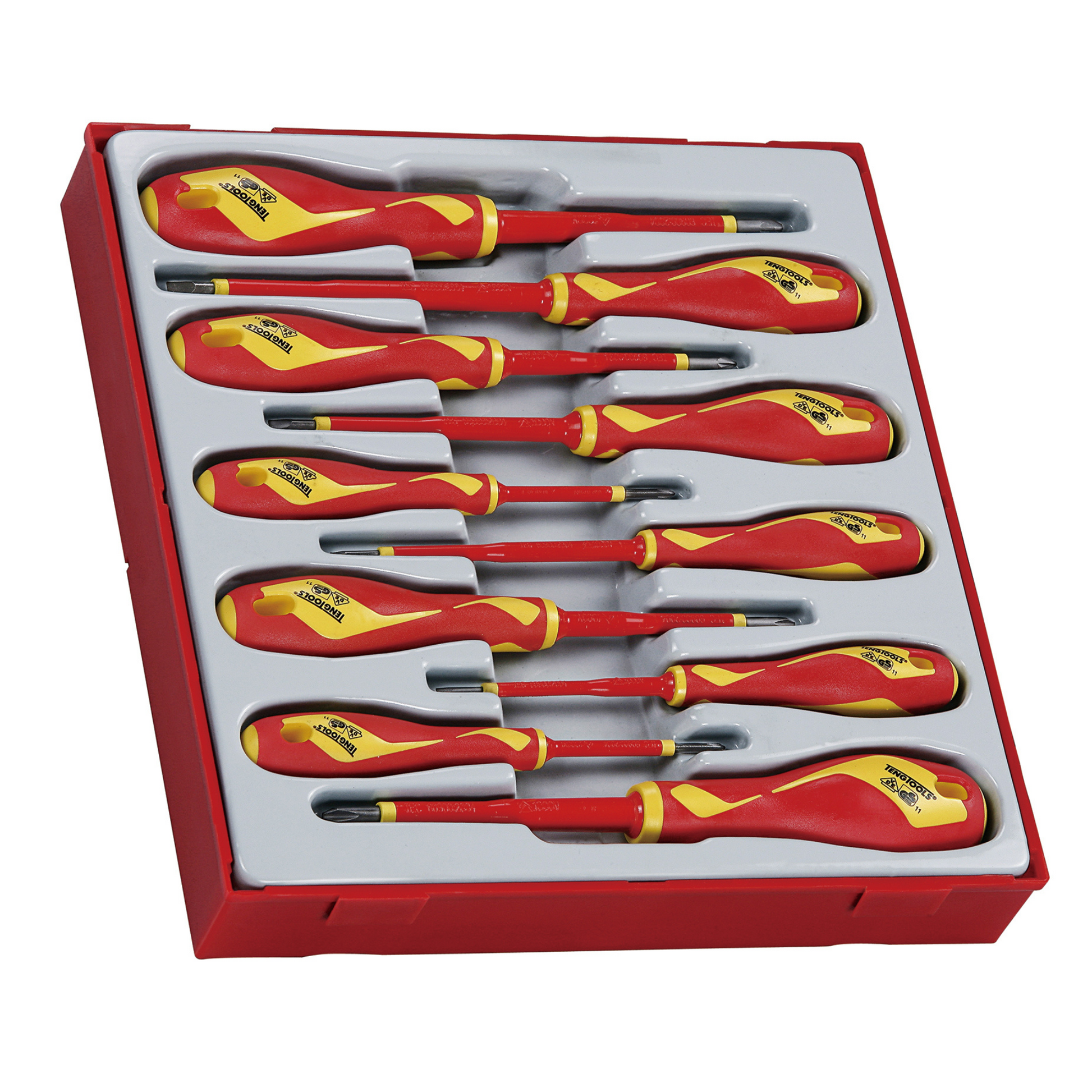 [ 3/8 INCH DRIVE SOCKET SET ] 6 point insulated sockets: 8, 9, 10, 11, 12, 13, 14, 15, 16, 17, 18, 19mm with a 1000 volt insulated 72 teeth ratchet & 3 inch long 1000 volt VDE insulated extension bar. [ PLIER SET ] 6 inch side cutter, 7 inch combination, 8 inch long nose and 7 inch wire stripping pliers. [ TORQUE SCREWDRIVER SET ] 1/4 inch drive 1-5Nm torque screwdriver supplied with an assortment of blades: 3mm, 4mm, 5.5mm, 6.5mm, PH1, PH2, PZ1, PZ2. [ MIXED SCREWDRIVER SET ] 2.5 x 75mm, 3.0 x 100mm, 4.0 x 100mm, 5.5 x 125mm slotted, PH0 x 60mm, PH1 x 80mm, PH2 x 100mm, PZ0x60mm, PZ1x80mm, PZ2 x 100mm. [ STORAGE TRAY ] 6 compartment storage tray for organizing loose items, spare parts and consumables. [ VDE INSULATED ] Meets the requirements of the internationally acknowledged European EN 60900 standards for use in electrically live environments. [ TWO COLOR PROTECTION ] Integrated protective insulation with two colours clearly indicates if there is any damage. [ INDIVIDUALLY TESTED ] Thoroughly verified by means of the impact strength, electrical, flame-retardancy, insulation adhesion and stamp tests. [ TOTAL TOOL ORGANIZATION ] The tools are supplied in unique tool trays which feature removable lids and dovetail joints. The trays can be used on their own as standalone sets or as part of our Get Organized system where every tray clicks together and fits perfectly in the tool box. [ PORTABLE CASE ] Hard wearing carrying case with distinctive branding, robust molded body with built in strength and durability and side handle for easy transport.